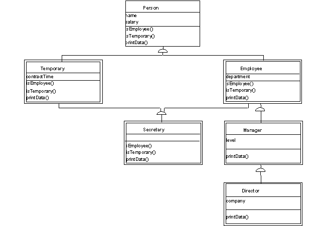There has to be engineered a program which deals with the information about the persons within a company. There are five types of persons (= employee types): temporary, employee, secretary, manager and director. Each of these person types has certain different properties, but it is possible to draw several dependencies between them (see ® 2 Class structure).