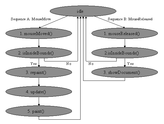 Sequence A - MouseMove: The ImageMenuApplet gets informed about a mouse movement by a call to the method mouseMoved(). This method checks, whether the mouse cursor is inside the bounds of the changing image and calls, if necessary, the repaint() method. Whether the mouse cursor is inside the area of the changing image or not is stored in the property variable flag. The repaint() method calls, if there is enough time, the update() method, which then calls the paint() method. This method draws depending on the state stored in the property variable flag the right changing image. This guaranties, that after the mouse cursor entered or left the area of the changing image the correct image will be shown.