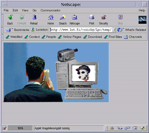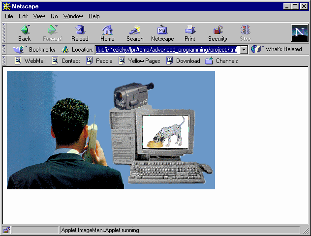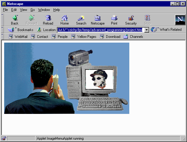 *The task of this project is to develop a program in the Java programming language. After starting the program the user should see an image. When the user moves the mouse cursor on a special part of the image (e.g. „the picture of Lena") this part of the image should be changed to another image. When the users clicks this special part of the image and the Java program is embodied in a HTML-browser this HTML-browser should show a specified document, given by an URL.