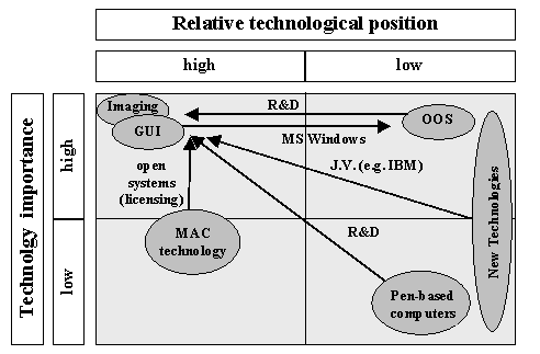 Basically, the technology position of Apple has been improved. The idea to give John Scully two positions - CEO and CTO - worked well. New ideas from Scully were integrated into new products, e.g. a Remote Access Desktop. A cooperation with IBM and Motorola will soon result in a new high-end processor - the Power PC processor. The advantage in object-oriented systems and pen-based computers led to the development of a new PDA (Personal Digital Assistant) - the so-called Newton. A cooperation with several Japanese companies will guarantee enough production facilities for the Newton. Apple started three programs to create better operational systems: